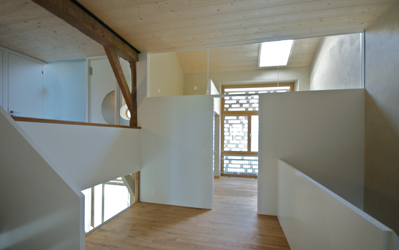 Die verschiedenen Raumhöhen des ehemaligen Ökonomieteils wurden wieder hergestellt. Ein spannend angelegter Erschliessungs-Weg führt durch die verschieden hohen Raumzonen vom Erdgeschoss bis ins Dachgeschoss.
